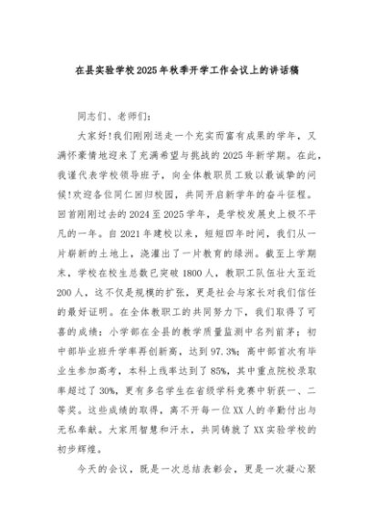 / 【七哥公文】2025年:在县实验学校2025年秋季开学工作会议上的讲话稿+更多免费公文+VX:QiGeGongWen2024
