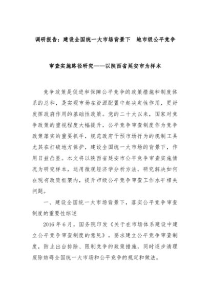 【七哥公文】2025年:调研报告:建设全国统一大市场背景下 地市级公平竞争审查实施路径研究——以陕西省延安市为样本+更多免费公文+VX:QiGeGongWen2024