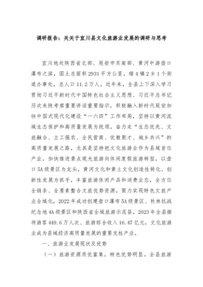 / 【七哥公文】2025年:调研报告:关关于宜川县文化旅游业发展的调研与思考+更多免费公文+VX:QiGeGongWen2024