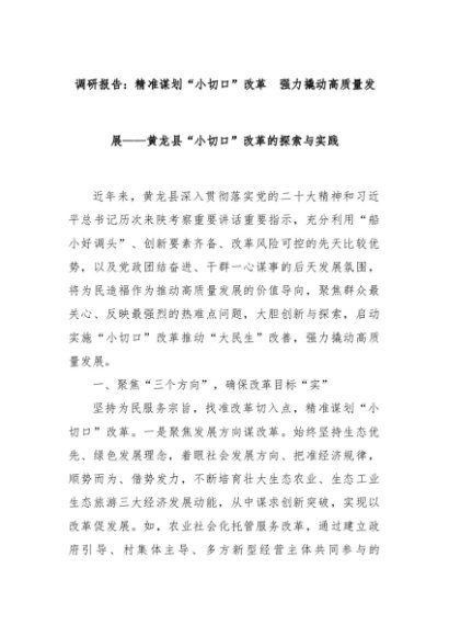 【七哥公文】2025年:调研报告:精准谋划“小切口”改革 强力撬动高质量发展——黄龙县“小切口”改革的探索与实践+更多免费公文+VX:QiGeGongWen2024