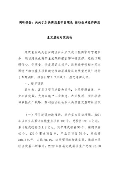 【七哥公文】2025年:调研报告:关关于加快高质量项目建设 推动县域经济高质量发展的对策浅析+更多免费公文+VX:QiGeGongWen2024