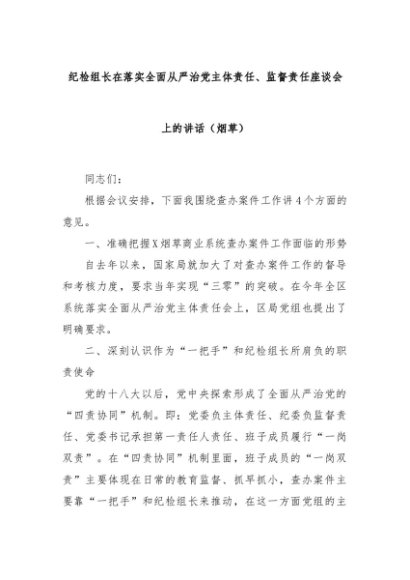 【七哥公文】2025年:纪检组长在落实全面从严治党主体责任、监督责任座谈会上的讲话(烟草)+更多免费公文+VX:QiGeGongWen2024