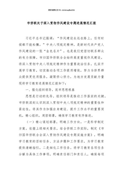 【七哥公文】2025年:【七哥公文】市侨联关于深入贯彻作风建设专题进展情况汇报+更多免费公文+VX:QiGeGongWen2024+更多免费公文+VX:QiGeGongWen2024