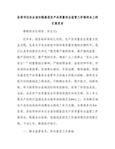 【七哥公文】2025年:县委书记在全省加强基层农产品质量安全监管工作推进会上的汇报发言+更多免费公文+VX:QiGeGongWen2024