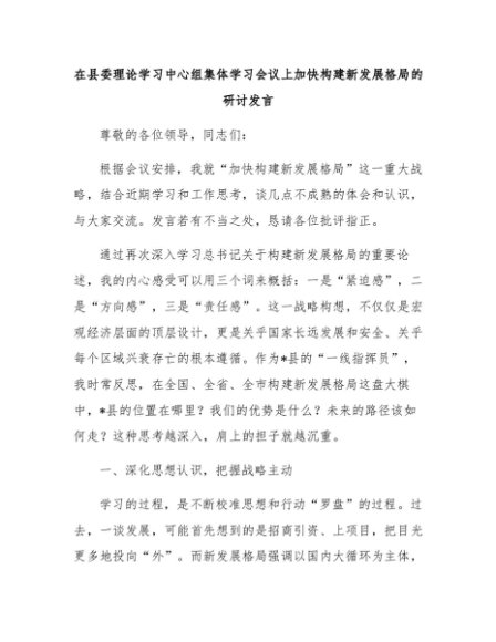 【七哥公文】2025年:在县委理论学习中心组集体学习会议上加快构建新发展格局的研讨发言+更多免费公文+VX:QiGeGongWen2024