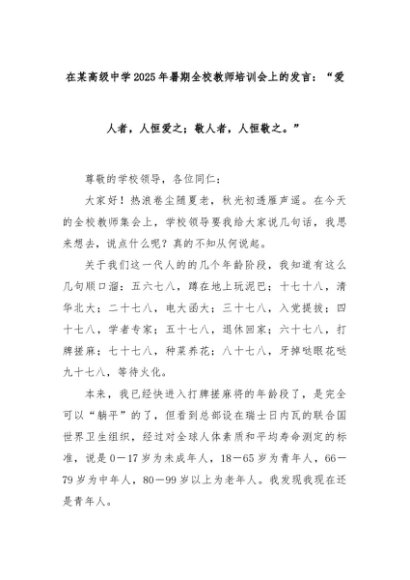 【七哥公文】2025年:在某高级中学2025年暑期全校教师培训会上的发言:“爱人者,人恒爱之;敬人者,人恒敬之。”+更多免费公文+VX:QiGeGongWen2024