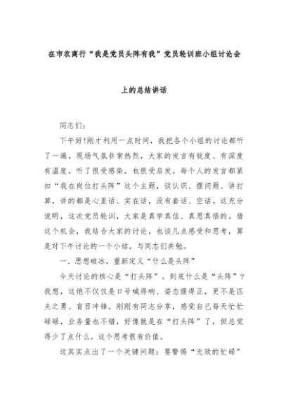 【七哥公文】2025年:在市农商行“我是党员头阵有我”党员轮训班小组讨论会上的总结讲话+更多免费公文+VX:QiGeGongWen2024