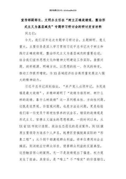 【七哥公文】2025年:【七哥公文】宣传部副部长、文明办主任在“树立正确政绩观、整治形式主义为基层减负”专题学习研讨会的研讨发言材料+更多免费公文+VX:QiGeGongWen2024+更多免费公文+VX:QiGeGongWen2024