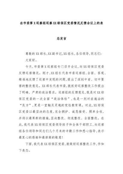 【七哥公文】2025年:在市委第X巡察组巡察XX综保区党委情况反馈会议上的表态发言+更多免费公文+VX:QiGeGongWen2024