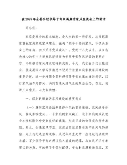 【七哥公文】2025年:在2025年全县科级领导干部家属廉洁家风座谈会上的讲话+更多免费公文+VX:QiGeGongWen2024