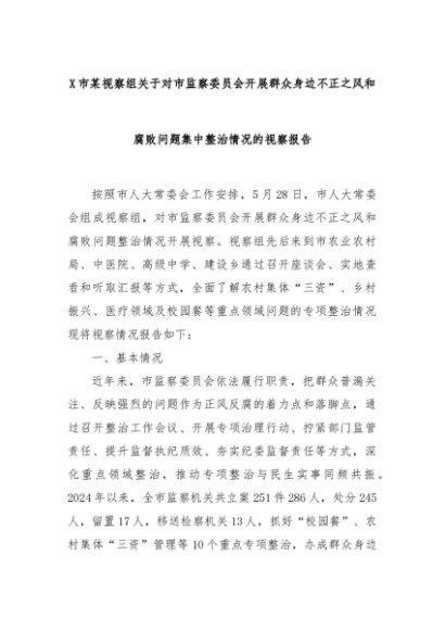 【七哥公文】2025年:X市某视察组关于对市监察委员会开展群众身边不正之风和腐败问题集中整治情况的视察报告+更多免费公文+VX:QiGeGongWen2024