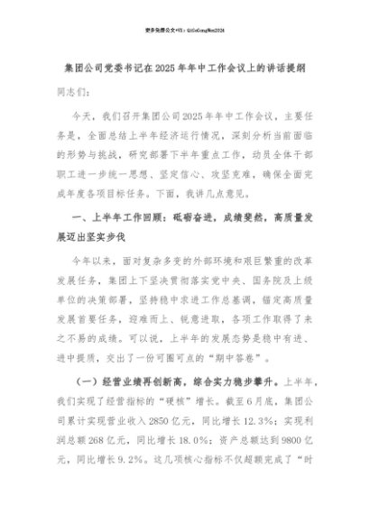 【七哥公文】2025年:【七哥公文】集团公司党委书记在2025年年中工作会议上的讲话提纲+更多免费公文+VX:QiGeGongWen2024+更多免费公文+VX:QiGeGongWen2024