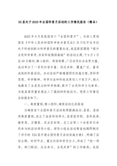【七哥公文】2025年:XX县关于2025年全国科普月活动的工作情况报告(精品)+更多免费公文+VX:QiGeGongWen2024