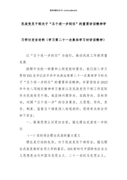 【七哥公文】2025年:【七哥公文】民政党员干部关于“五个进一步到位”的重要讲话精神学习研讨发言材料(学习第二十一次集体学习时讲话精神)_副本+更多免费公文+VX:QiGeGongWen2024+更多免费公文+VX:QiGeGongWen2024