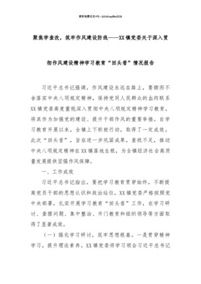 【七哥公文】2025年:【七哥公文】聚焦学查改,筑牢作风建设防线——XX镇党委关于深入贯彻作风建设精神学习教育“回头看”情况报告+更多免费公文+VX:QiGeGongWen2024+更多免费公文+VX:QiGeGongWen2024