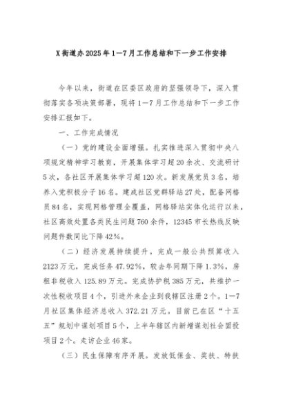 【七哥公文】2025年:X街道办2025年1-7月工作总结和下一步工作安排+更多免费公文+VX:QiGeGongWen2024