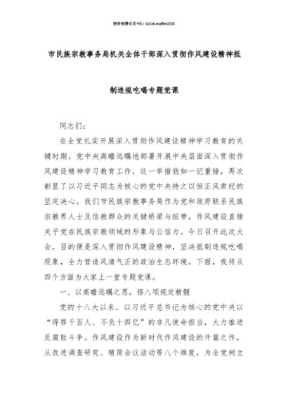 【七哥公文】2025年:【七哥公文】市民族宗教事务局机关全体干部深入贯彻作风建设精神抵制违规吃喝专题党课+更多免费公文+VX:QiGeGongWen2024+更多免费公文+VX:QiGeGongWen2024