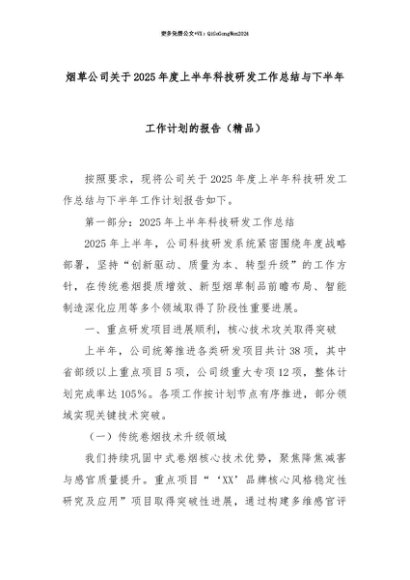 【七哥公文】2025年:【七哥公文】烟草公司关于2025年度上半年科技研发工作总结与下半年工作计划的报告(精品)+更多免费公文+VX:QiGeGongWen2024+更多免费公文+VX:QiGeGongWen2024