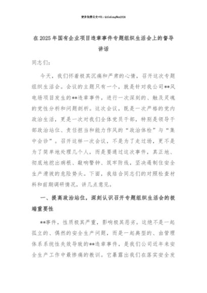 【七哥公文】2025年:【七哥公文】在2025年国有企业项目违章事件专题组织生活会上的督导讲话+更多免费公文+VX:QiGeGongWen2024+更多免费公文+VX:QiGeGongWen2024