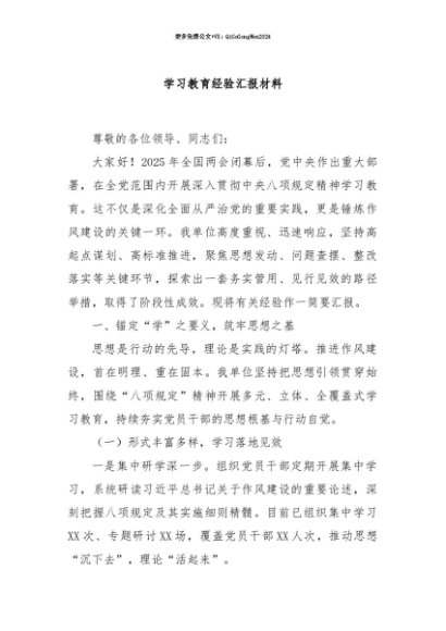 【七哥公文】2025年:【七哥公文】学习教育经验汇报材料+更多免费公文+VX:QiGeGongWen2024+更多免费公文+VX:QiGeGongWen2024