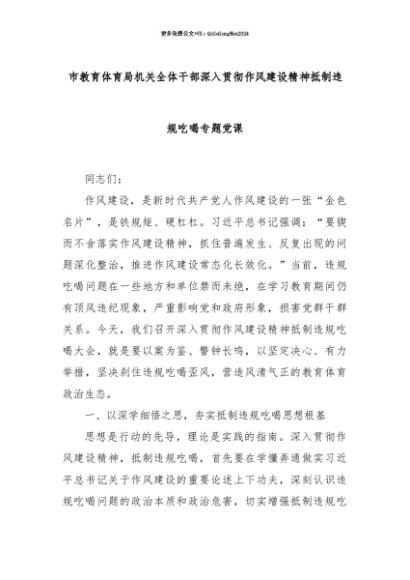 【七哥公文】2025年:【七哥公文】市教育体育局机关全体干部深入贯彻作风建设精神抵制违规吃喝专题党课+更多免费公文+VX:QiGeGongWen2024+更多免费公文+VX:QiGeGongWen2024