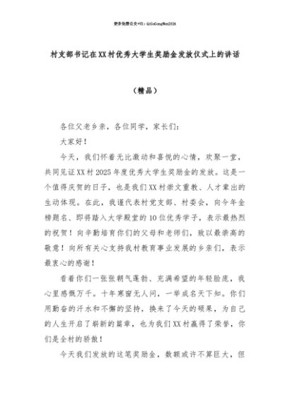【七哥公文】2025年:【七哥公文】村支部书记在XX村优秀大学生奖励金发放仪式上的讲话(精品)+更多免费公文+VX:QiGeGongWen2024+更多免费公文+VX:QiGeGongWen2024