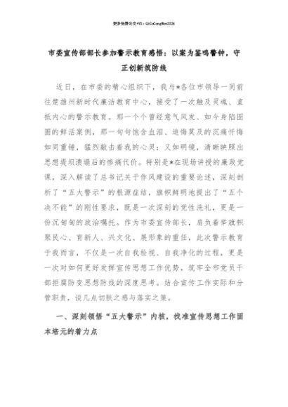 【七哥公文】2025年:【七哥公文】市委宣传部部长参加警示教育感悟:以案为鉴鸣警钟,守正创新筑防线+更多免费公文+VX:QiGeGongWen2024+更多免费公文+VX:QiGeGongWen2024