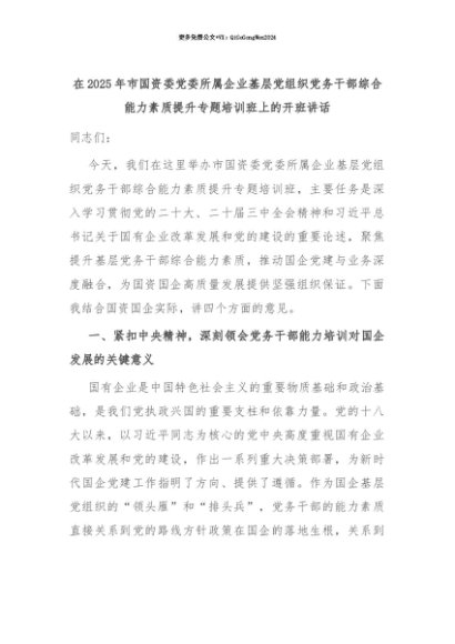 【七哥公文】2025年:【七哥公文】在2025年市国资委党委所属企业基层党组织党务干部综合能力素质提升专题培训班上的开班讲话+更多免费公文+VX:QiGeGongWen2024+更多免费公文+VX:QiGeGongWen2024