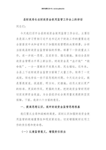【七哥公文】2025年:【七哥公文】县财政局长在财政资金使用监管工作会上的讲话+更多免费公文+VX:QiGeGongWen2024+更多免费公文+VX:QiGeGongWen2024