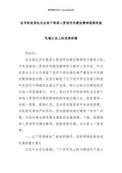 【七哥公文】2025年:【七哥公文】在市财政局机关全体干部深入贯彻作风建设精神抵制违规吃喝大会上的党课讲稿+更多免费公文+VX:QiGeGongWen2024+更多免费公文+VX:QiGeGongWen2024