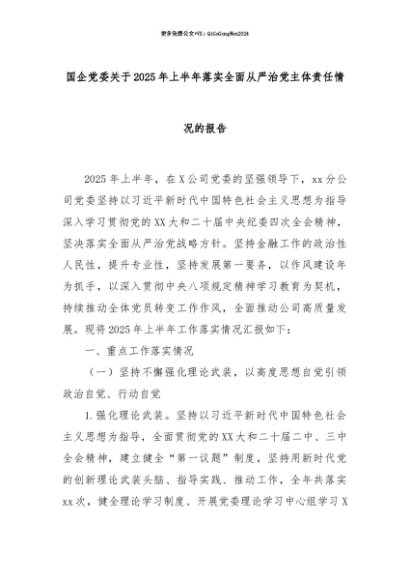 【七哥公文】2025年:【七哥公文】国企党委关于2025年上半年落实全面从严治党主体责任情况的报告+更多免费公文+VX:QiGeGongWen2024+更多免费公文+VX:QiGeGongWen2024