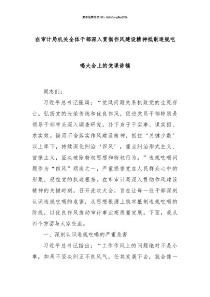 【七哥公文】2025年:【七哥公文】在审计局机关全体干部深入贯彻作风建设精神抵制违规吃喝大会上的党课讲稿+更多免费公文+VX:QiGeGongWen2024+更多免费公文+VX:QiGeGongWen2024