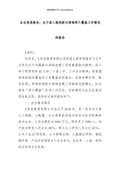 【七哥公文】2025年:【七哥公文】企业党委报告:关于深入推进新兴领域两个覆盖工作情况的报告+更多免费公文+VX:QiGeGongWen2024+更多免费公文+VX:QiGeGongWen2024