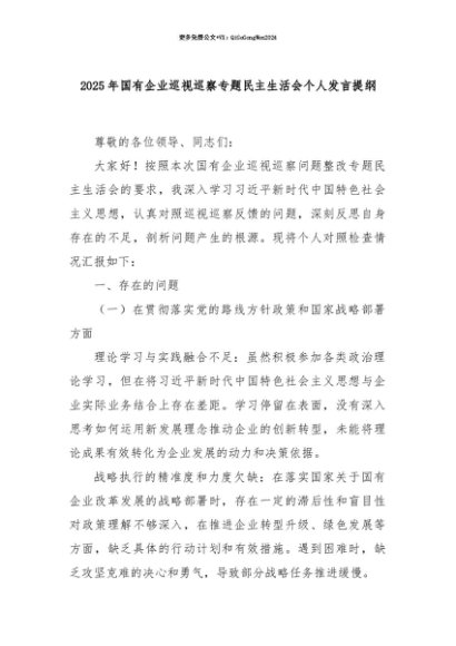 【七哥公文】2025年:【七哥公文】2025年国有企业巡视巡察专题民主生活会个人发言提纲+更多免费公文+VX:QiGeGongWen2024+更多免费公文+VX:QiGeGongWen2024
