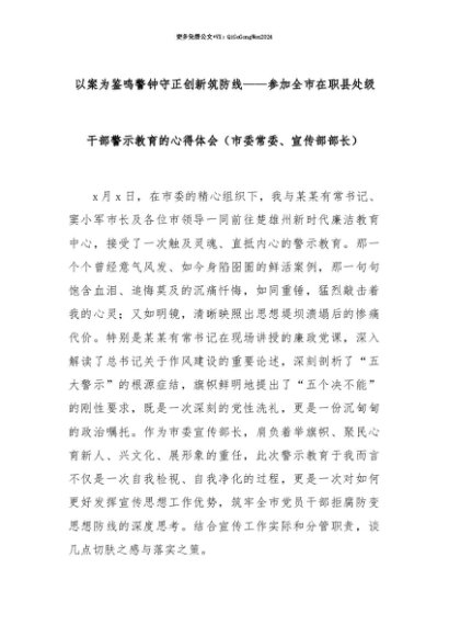 【七哥公文】2025年:【七哥公文】以案为鉴鸣警钟守正创新筑防线——参加全市在职县处级干部警示教育的心得体会(市委常委、宣传部部长)+更多免费公文+VX:QiGeGongWen2024+更多免费公文+VX:QiGeGongWen2024