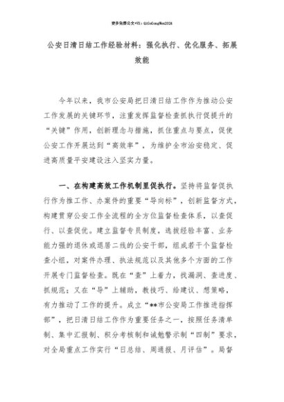 【七哥公文】2025年:【七哥公文】公安日清日结工作经验材料:强化执行、优化服务、拓展效能+更多免费公文+VX:QiGeGongWen2024+更多免费公文+VX:QiGeGongWen2024