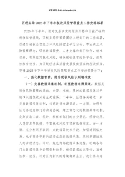 【七哥公文】2025年:【七哥公文】区税务局2025年下半年税收风险管理重点工作安排部署+更多免费公文+VX:QiGeGongWen2024+更多免费公文+VX:QiGeGongWen2024
