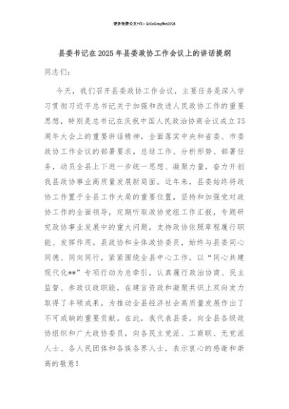 【七哥公文】2025年:【七哥公文】县委书记在2025年县委政协工作会议上的讲话提纲+更多免费公文+VX:QiGeGongWen2024+更多免费公文+VX:QiGeGongWen2024