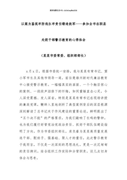 【七哥公文】2025年:【七哥公文】以案为鉴筑牢防线扛牢责任锻造铁军——参加全市在职县处级干部警示教育的心得体会(某某市委常委、组织部部长)+更多免费公文+VX:QiGeGongWen2024+更多免费公文+VX:QiGeGongWen2024