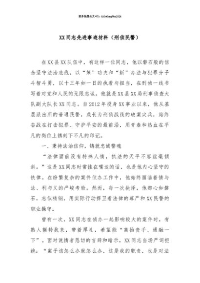 【七哥公文】2025年:【七哥公文】XX同志先进事迹材料(刑侦民警)+更多免费公文+VX:QiGeGongWen2024+更多免费公文+VX:QiGeGongWen2024