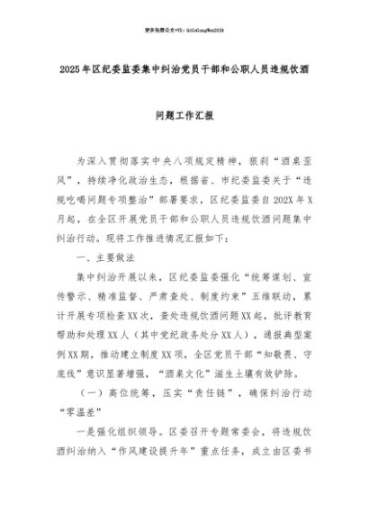 【七哥公文】2025年:【七哥公文】2025年区纪委监委集中纠治党员干部和公职人员违规饮酒问题工作汇报+更多免费公文+VX:QiGeGongWen2024+更多免费公文+VX:QiGeGongWen2024
