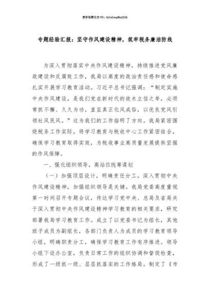 【七哥公文】2025年:【七哥公文】专题经验汇报:坚守作风建设精神,筑牢税务廉洁防线+更多免费公文+VX:QiGeGongWen2024+更多免费公文+VX:QiGeGongWen2024