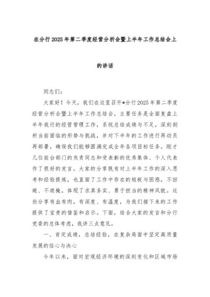 【七哥公文】2025年:在分行2025年第二季度经营分析会暨上半年工作总结会上的讲话+更多免费公文+VX:QiGeGongWen2024