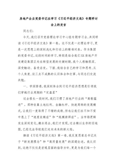 【七哥公文】2025年:房地产企业党委书记在学习《习近平经济文选》专题研讨会上的发言+更多免费公文+VX:QiGeGongWen2024