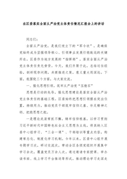 / 【七哥公文】2025年:在区委落实全面从严治党主体责任情况汇报会上的讲话+更多免费公文+VX:QiGeGongWen2024