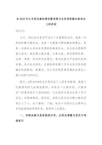 【七哥公文】2025年:在2025年公司党风廉政建设暨党建与业务深度融合推进会上的讲话+更多免费公文+VX:QiGeGongWen2024