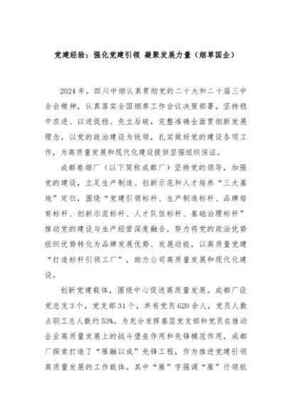 / 【七哥公文】2025年:党建经验:强化党建引领 凝聚发展力量(烟草国企)+更多免费公文+VX:QiGeGongWen2024