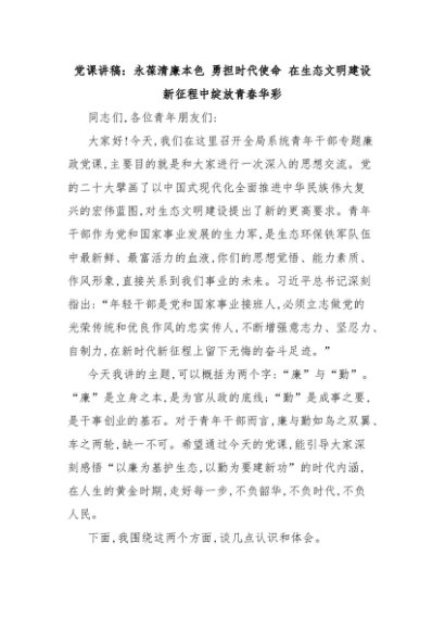 【七哥公文】2025年:党课讲稿:永葆清廉本色 勇担时代使命 在生态文明建设新征程中绽放青春华彩+更多免费公文+VX:QiGeGongWen2024