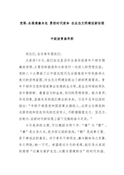 【七哥公文】2025年:党课:永葆清廉本色 勇担时代使命 在生态文明建设新征程中绽放青春华彩+更多免费公文+VX:QiGeGongWen2024