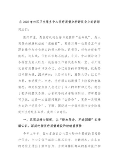 【七哥公文】2025年:在2025年社区卫生服务中心医疗质量分析评议会上的讲话+更多免费公文+VX:QiGeGongWen2024